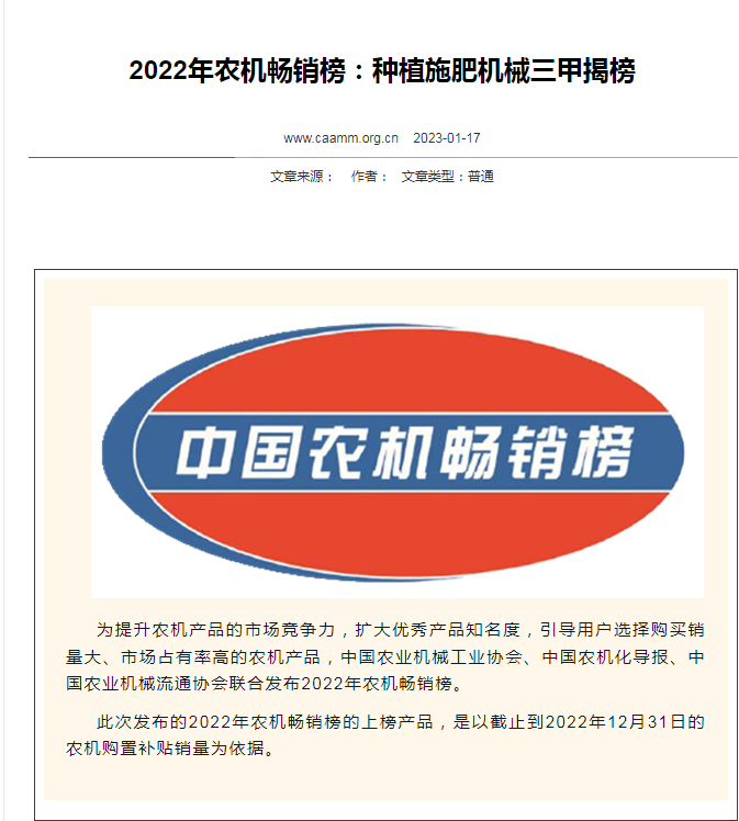 亞澳農(nóng)機(jī)榮獲2022年耕整地機(jī)械和 種植施肥機(jī)械農(nóng)機(jī)暢銷(xiāo)三甲榜
